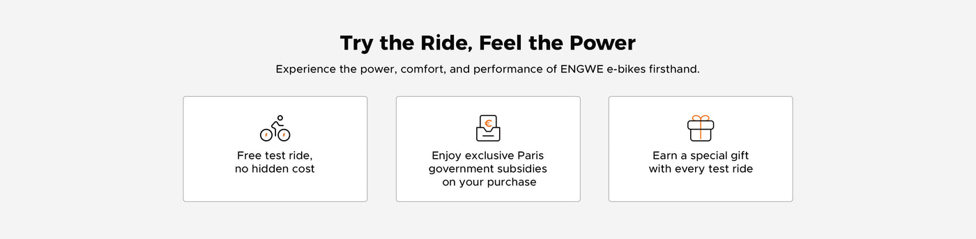 During a test ride, you’ll have the opportunity to experience the performance and features of an ENGWE eBike firsthand. A knowledgeable staff member will be available to guide you through the eBike’s functions, answer any questions, and help you adjust the eBike for a comfortable ride.