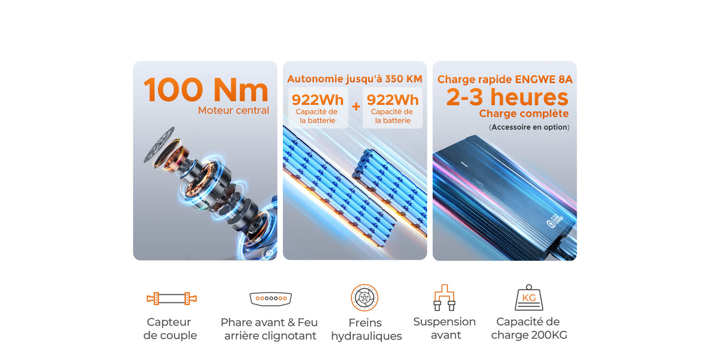 Avec le chargeur rapide ENGWE 8 A, rechargez complètement votre Engwe LE20 en 2 à 3 heures, ce qui vous permet de gagner du temps et de voyager plus facilement. Compatible uniquement avec le modèle LE20. Ne convient pas aux autres vélos électriques.