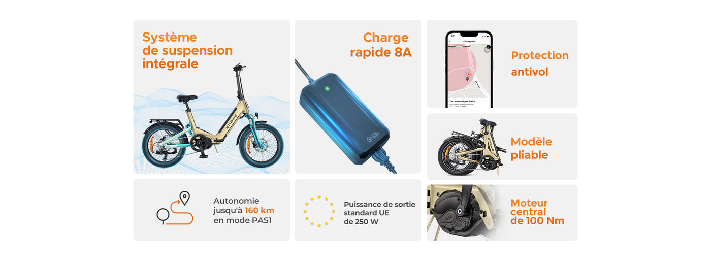Vélo électrique compact à suspension intégrale avec moteur central 250W et couple de 100 Nm